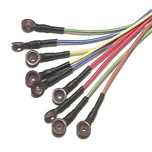 High quality 10mm cast silver disc electrodes with a silver chloride finish and non-tangle silicone rubber leads in five different colours. Standard connectors 1.5mm ‘touchproof’ (T/P) sockets, conforming to DIN 42 802. These electrodes are autoclavable.